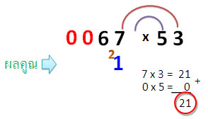 ตัวอย่างนี้ใส่ 0 ไว้หน้าตัวตั้ง 2 ตัวเพราะตัวคูณเป็นเลข 2 หลัก