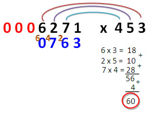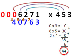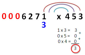 จำนวนคู่ที่คูณกันเท่ากับจำนวนหลักของตัวคูณ ดังนั้นในตัวอย่างนี้จะมี 3 คู่ คือ คู่นอก คู่กลาง และคู่ใน