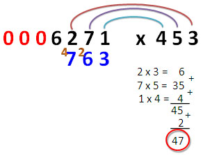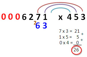 ถ้าได้เป็นเลขสองหลักให้ใส่หลักหน่วยและทดหลักสิบไปตำแหน่งถัดไป
